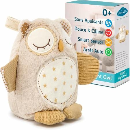 Cloud b Machine à sons Apaisants | Animal en Peluche | 4 bruits blancs et 4 berceuses | Arrêt automatique | Smart Sensor | Peluche Musicale berceuse Hibou Nighty Night Owl Smart Sensor