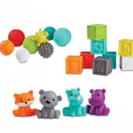 Cette valisette contient huit cubes sensoriels, huit balles aux formes et aux textures variées et quatre personnages en forme d'animaux. En plastique souple et léger pour faciliter la préhension, ils offrent à bébé des heures de manipulation et d'éveil sensoriel. Quand le jeu est terminé, tout se range dans la valisette qui facilite le transport.