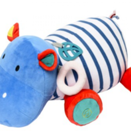 Voici une grande, une immense peluche d'activités ! Votre bébé découvre toutes les activités d'éveil de cet hippopotame : il touche sa matière douce, ses oreilles et son visage tout rond. Il découvre aussi du papier bruissant dans une oreille, un pouet dans l'autre. Chaque patte lui réserve une surprise : un miroir, un grelot, et même une douce mélodie déclencher ! Sur le dessus, bébé poursuit ses découvertes avec le donut souple et un anneau de dentition en forme de feuille, bien utile pour soulager ses poussées dentaires. Plus qu'une peluche d'activités, l'hippo est si grand que votre enfant va adorer monter dessus et en profiter pour lui faire des câlins !